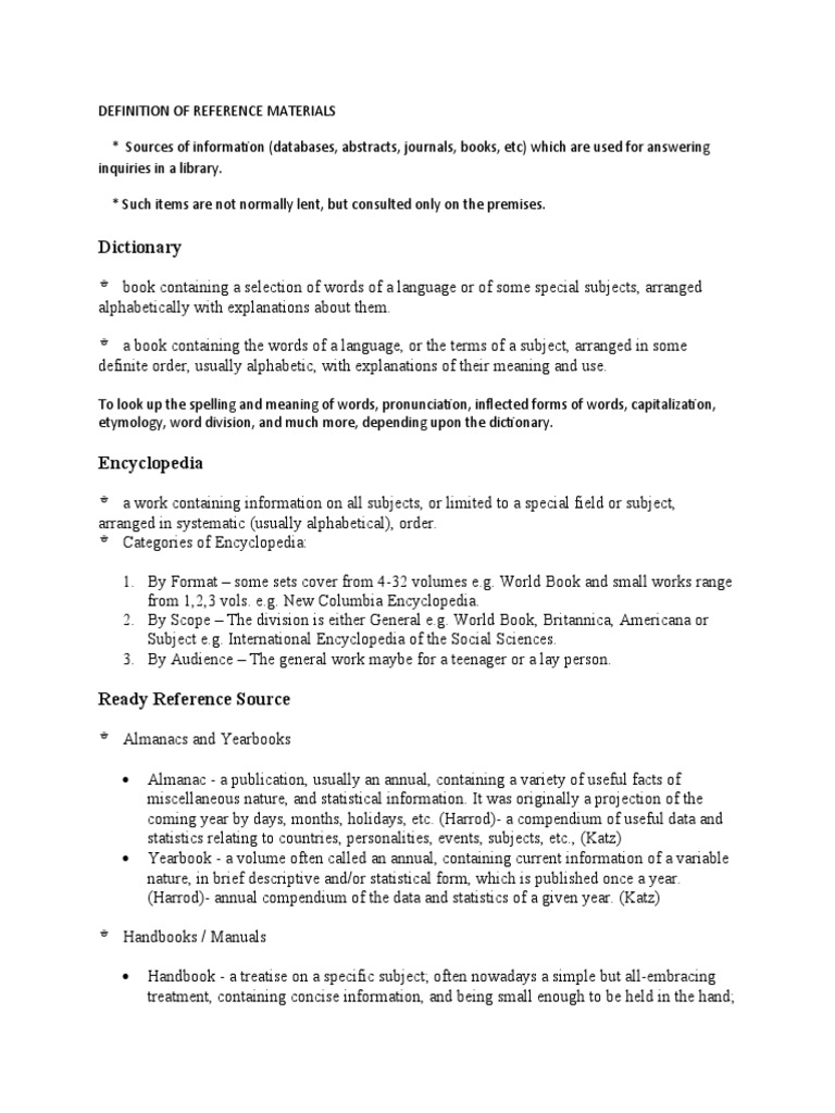 Dictionaries, encyclopedias, bibliographies, almanacs, directories, atlases, and handbooks.